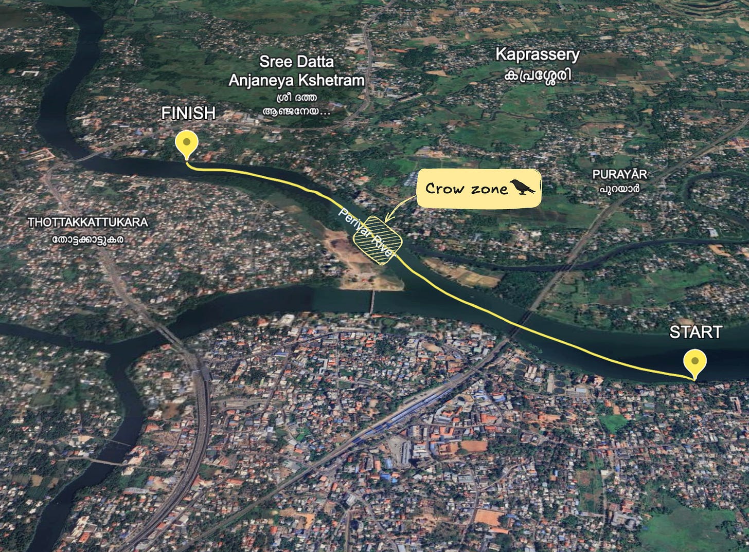 These days, my training for the Murshidabad swim event has led me to an almost daily ritual: slipping into the Periyar for an evening 3 km swim. The river itself has its moods — soft one day, restless the next — but there’s one stretch that has become something else entirely. I’ve marked it on the map as Crow zone.